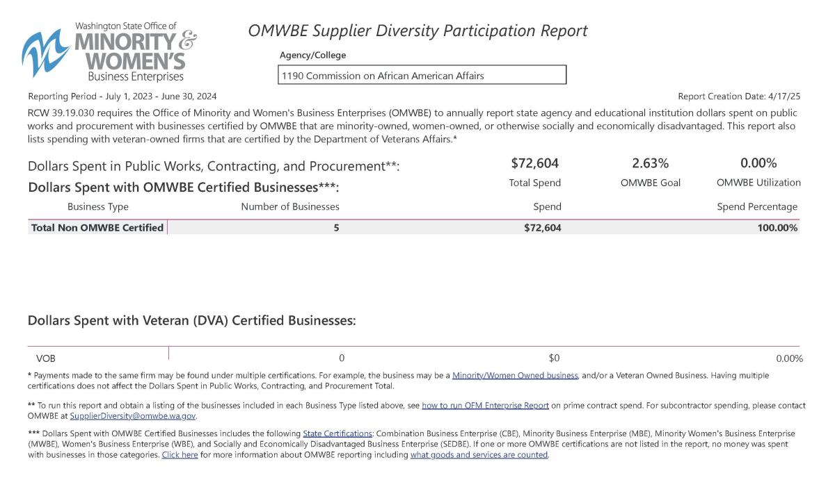 *CAAA spend is with both OMWBE certified and non-certified businesses. For information about OMWBE and its certification process, navigate to OMWBE.WA.gov.