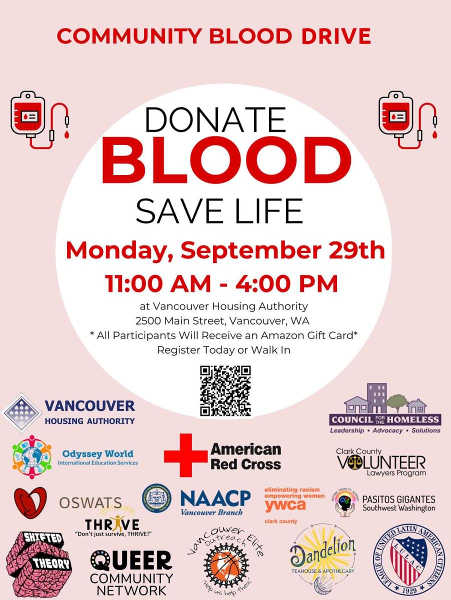 NAACP Vancouver and partners present a Community Blood Drive! The NAACP Vancouver Branch is proud to support the upcoming Community Blood Drive hosted by Vancouver Housing Authority - 2500 Main Street, Vancouver, WA